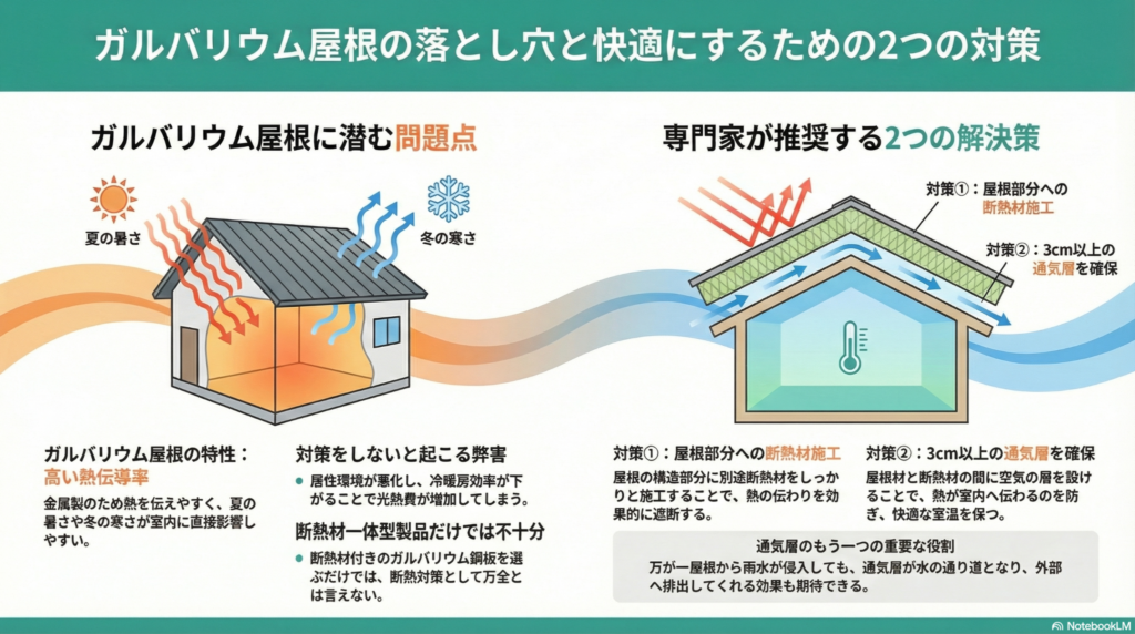 ガルバリウム屋根を選ぶ際に見落としがちなのが「断熱・通気対策」です。