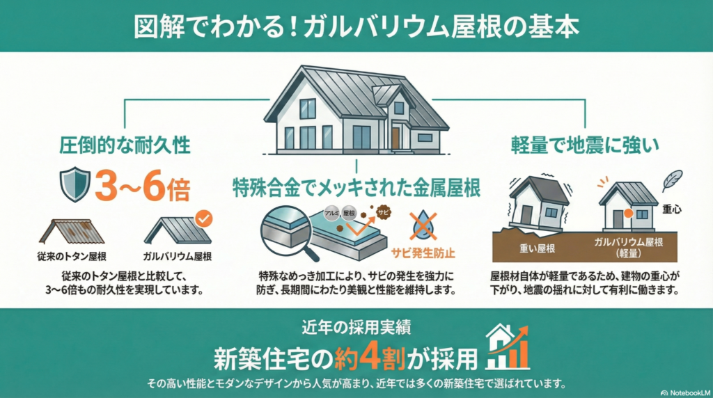 近年では新築住宅の約4割がガルバリウム屋根を採用しているほど人気が高まっています。