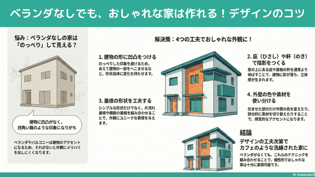 ベランダがないと建物の凹凸が少なくなり、外観にメリハリを出しにくくなるという悩みもよく聞きます。