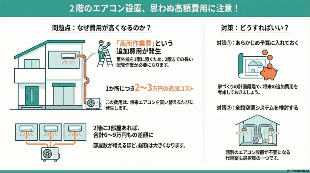 2階建ての家で2階にベランダがない場合、エアコンの室外機を地面(1階)に置かなければなりません。すると、2階から1階まで長い配管をつなぐための高所作業費が追加でかかってしまうんです。