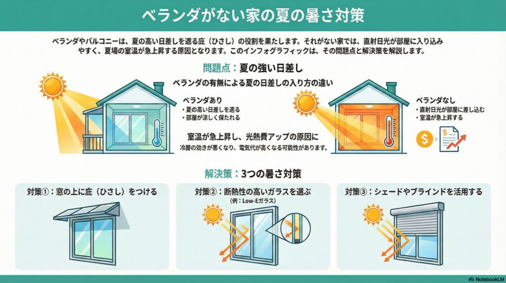 本来、ベランダやバルコニーは庇代わりになって、夏の日差しを遮る役割を果たしてくれます。それがなくなると、太陽の光がダイレクトに窓に当たってしまいます。