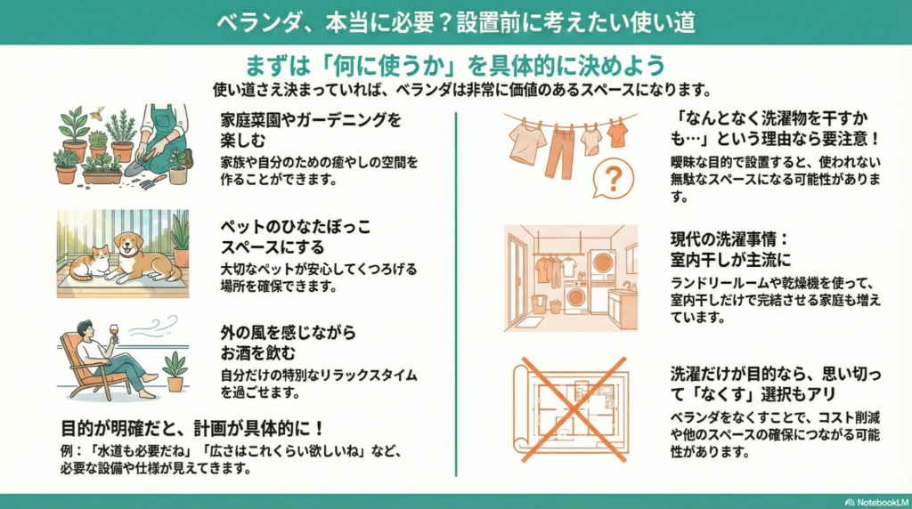 ベランダの使用目的がはっきりすれば、水道の設置や広さの目安など、計画が具体的になります。