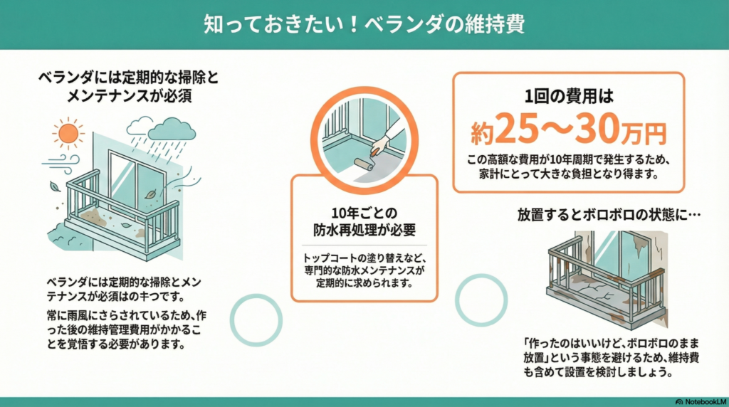 ベランダを作るなら、定期的な掃除とメンテナンス費用がかかる点を覚悟しておきましょう。