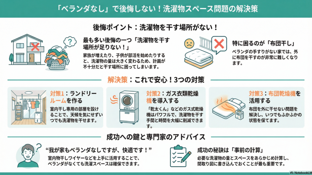 最も多い後悔のひとつは、洗濯物を干す場所が足りなくなる点です。